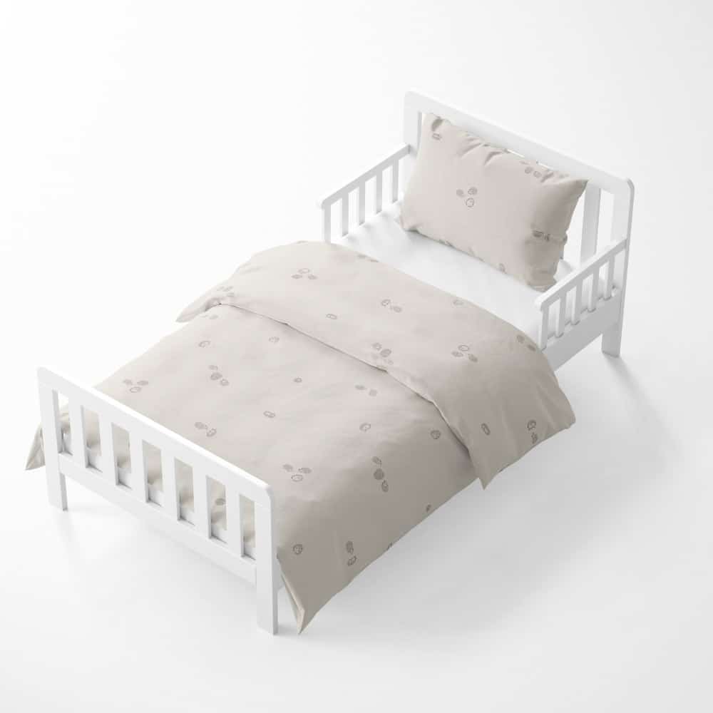 מצעים למיטת מעבר עשויים מ100% כותנה סרוקה רכה, בעיצוב קיפודים קטנטנים ומתוקים, משחקים על רקע בגוון אוטמיל רך, חמים ומלטף.