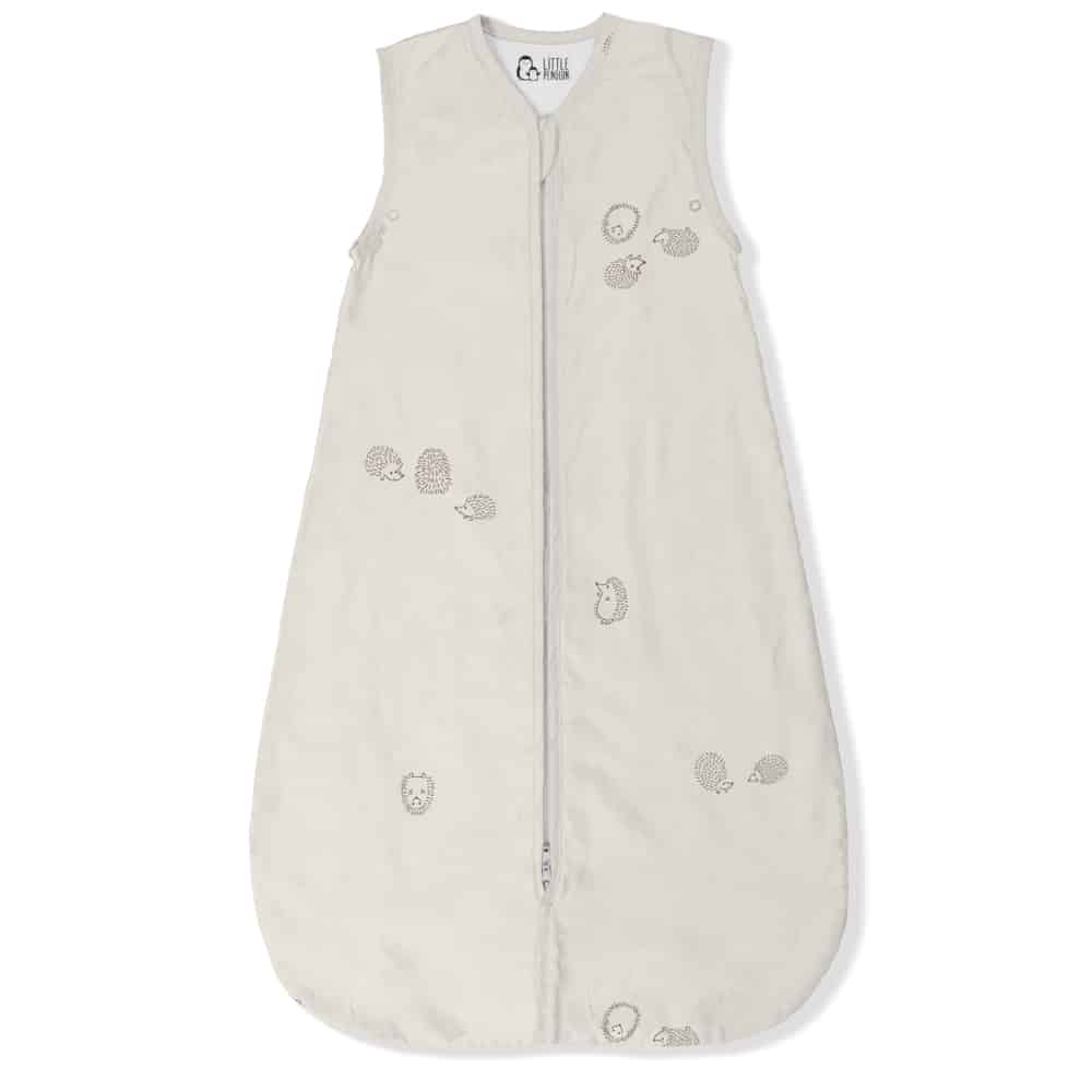 שק שינה בעיצוב קיפודים קטנטנים ומתוקים, משחקים על רקע בגוון אוטמיל רך, חמים ומלטף.